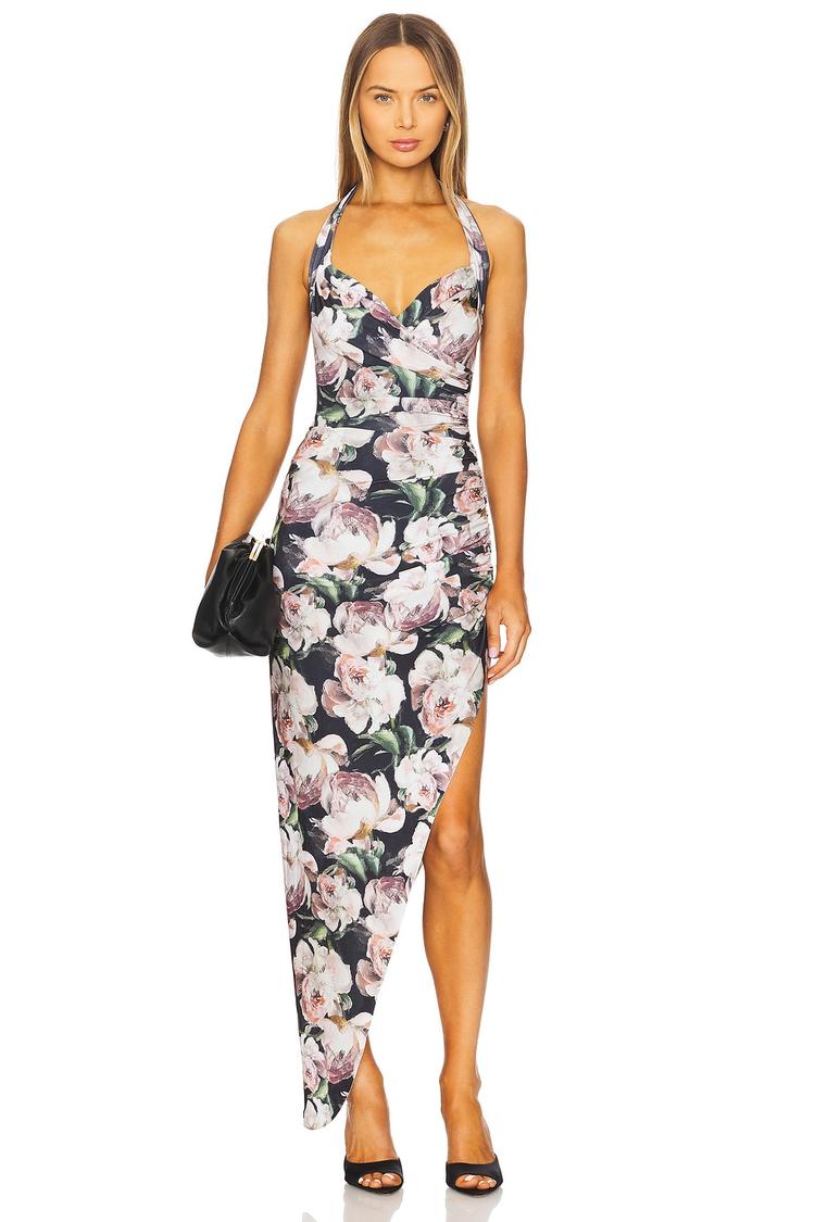 Soft floral jersey fabric shapes a fitted slip dress with a striking halter neck and delicate spaghetti straps. The asymmetrical hemline with a side slit and ruched seams adds dynamic texture and allure, perfect for spring and summer evenings. This elegant gown offers a modern, sexy silhouette ideal for date nights, cocktail parties, and nights out, combining comfort and sophistication in lightweight polyester-spandex blend. Its partially lined construction ensures a smooth fit while the strappy back keeps the design minimal yet captivating.