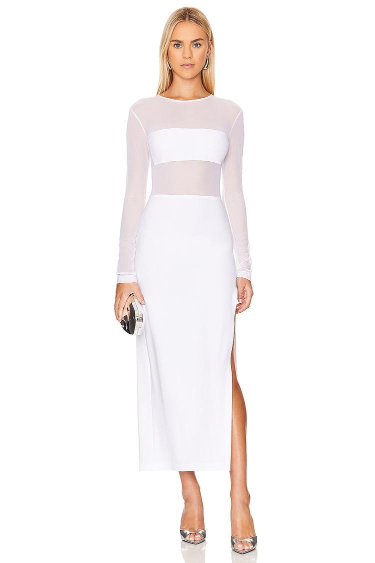 Soft white fabric paired with sheer mesh paneling creates a sleek, modern column silhouette that hugs the body. This fitted maxi gown features a round neckline and long sleeves that add elegant coverage, while the daring side slit enhances movement and allure. Crafted from lightweight polyester, spandex, and nylon blend jersey, it offers comfortable stretch and a flattering fit. Ideal for cocktail parties, night outs, or romantic date nights, this gown effortlessly blends sophistication and contemporary sexiness for versatile all-weather wear.