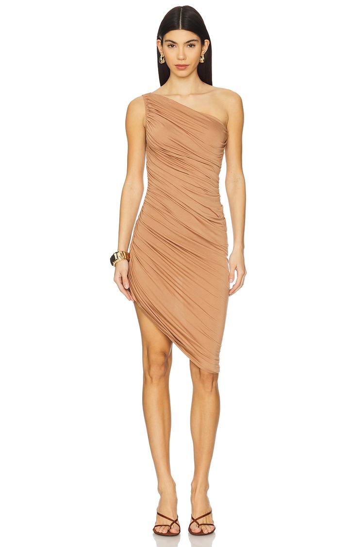 Soft jersey fabric with a touch of stretch sculpts this mini dress into a sleek bodycon silhouette. The asymmetric hem and one-shoulder strap add modern flair, while delicate ruching all over enhances texture and shape. Its matte tan hue offers versatile elegance perfect for date nights, cocktail parties, or stylish evenings out. The pull-on styling and partial lining with an attached bodysuit ensure comfort and ease, making this dress a confident choice for warm-weather and transitional seasons alike.