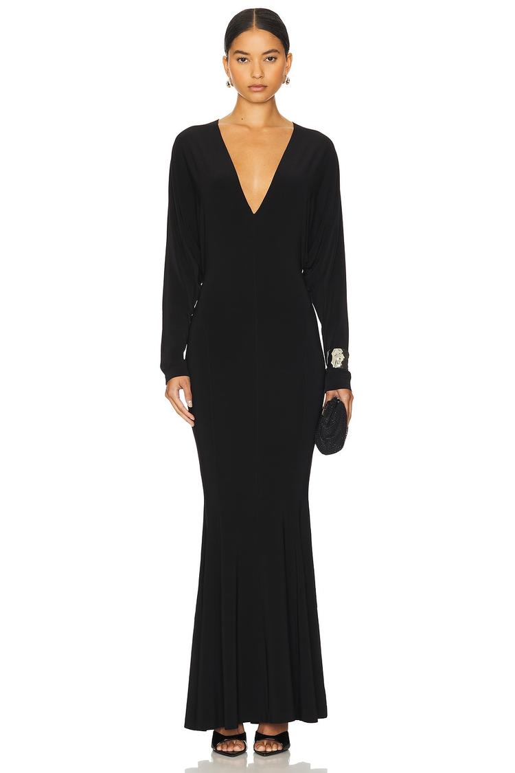 Soft matte black fabric forms a sleek column silhouette in this fitted fishtail gown, featuring a striking deep V neckline and long regular sleeves for a timeless look. The maxi length with a clean hemline enhances its elegant flow, crafted from lightweight polyester and spandex jersey fabric that offers comfort and subtle stretch. Ideal for cocktail parties, formal events, or stylish nights out, this minimalist and sophisticated dress embodies refined glamour while delivering an easy slip-on fit. Its covered back and unlined construction keep the design clean and modern.