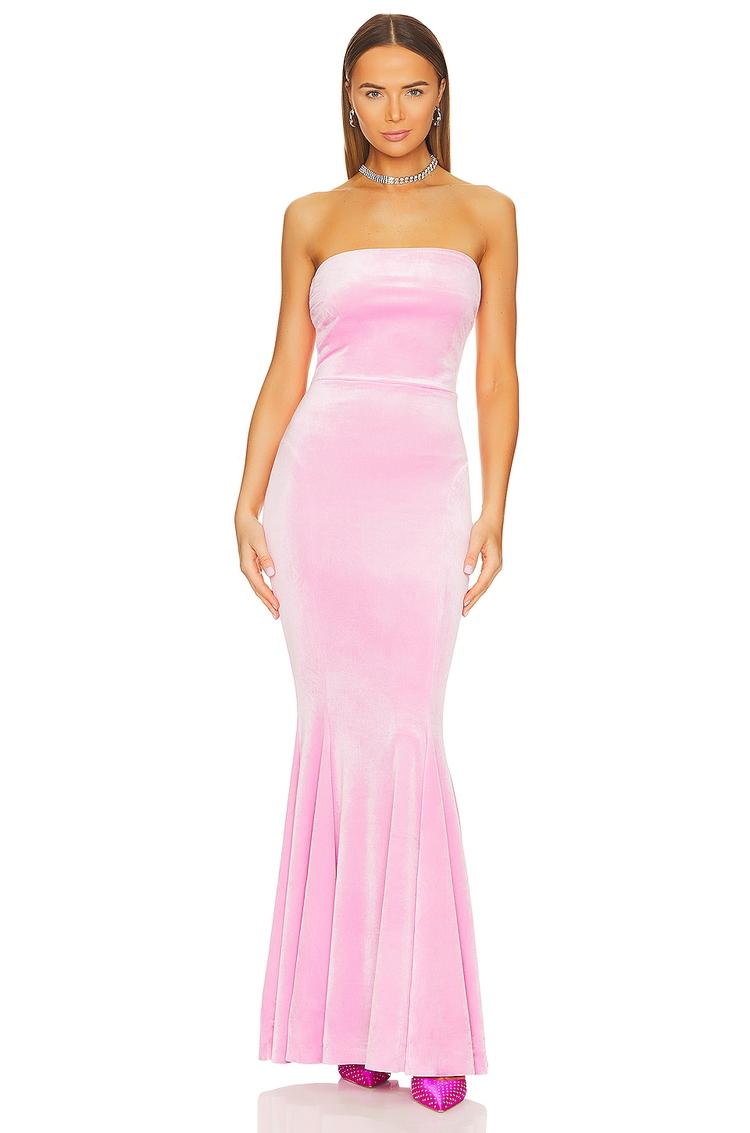 Soft velvet fabric in a matte pink shade creates a sleek column silhouette with a fitted bodice and flared fishtail hem. The strapless straight neckline and sleeveless styling highlight the shoulders elegantly, perfect for cocktail evenings or formal night outs. This maxi gown offers a sophisticated and sexy look, combining timeless classic style with a modern fit. Crafted from a polyester and elastane blend, it promises comfort and a smooth pull-on fit, making it an ideal choice for special occasions that demand both style and ease.