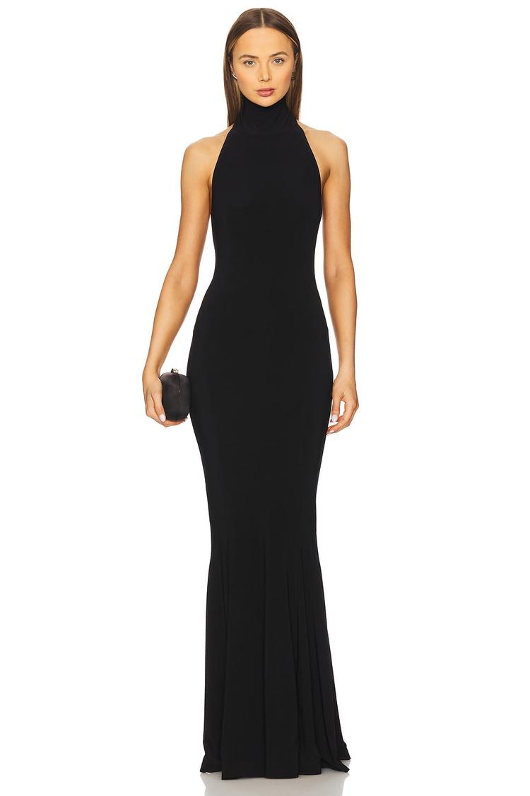 Sleek and timeless, this matte black column gown features a fitted silhouette with a dramatic fishtail hem that flows elegantly to the floor. Crafted from heavyweight slinky jersey fabric blending polyester and spandex, it offers a comfortable stretch while maintaining structure. The halter neckline and sleeveless design highlight the shoulders, perfect for cocktail parties, formal events, or sophisticated date nights. Pullover styling adds ease, while the clean hemline completes the look with understated sophistication for versatile evening wear.
