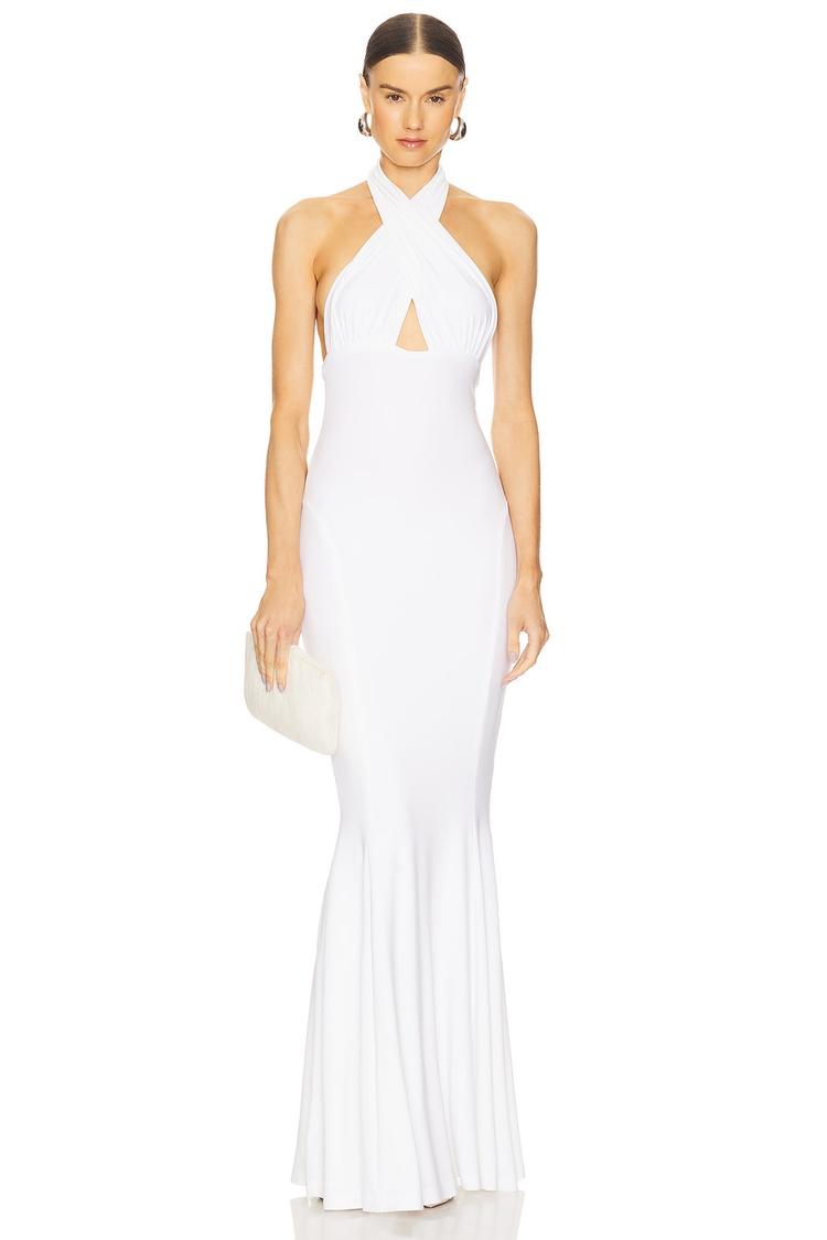 A sleek halter neckline and fitted column silhouette define this elegant white gown. Crafted from a stretchy polyester-spandex jersey blend, it features a graceful fishtail flare at the hem for dramatic movement. The open back and sleeveless styling add an alluring touch while maintaining sophistication. Ideal for formal events, cocktail parties, and wedding guest occasions, this maxi-length dress offers a figure-flattering fit with easy pull-on wearability. The minimalist solid white design enhances its timeless appeal for versatile seasonal wear.