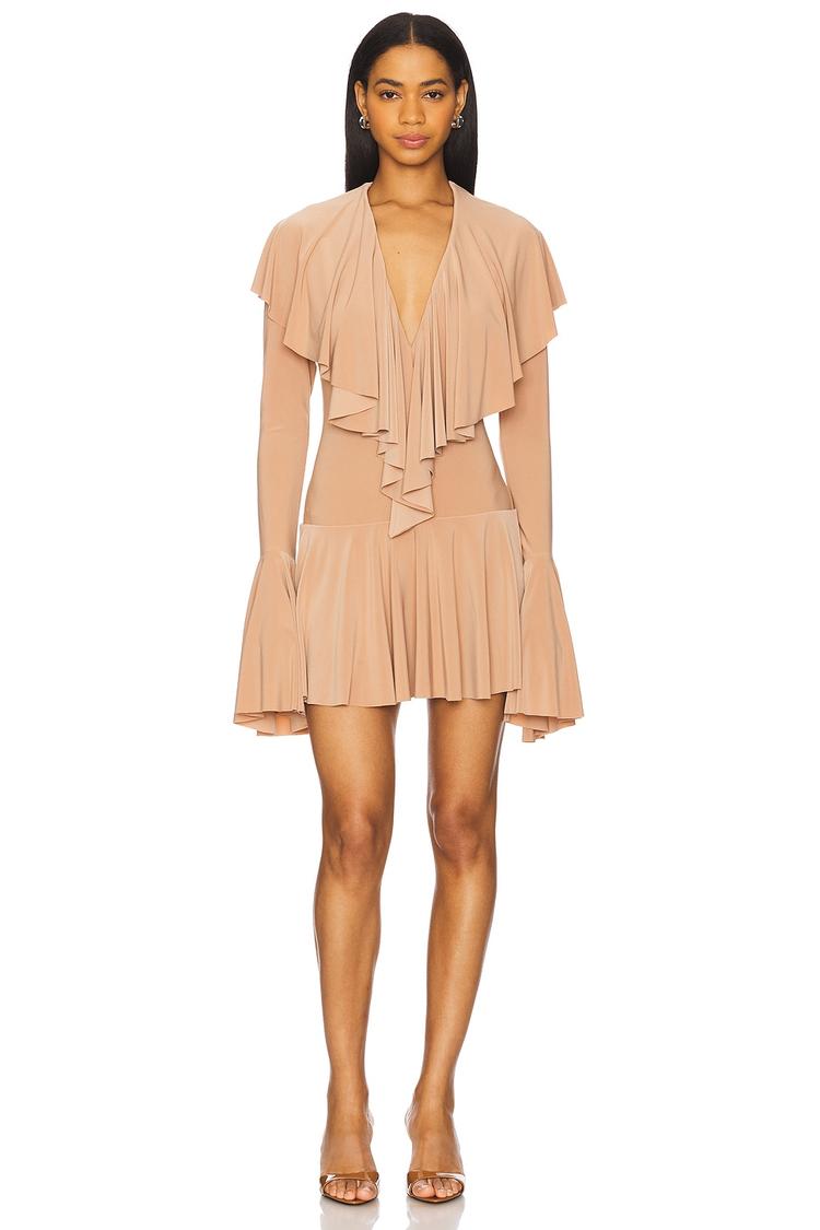Softly draped ruffles cascade along the V-neckline, cuffs, and ruffled hem of this mini shift dress, crafted from a heavyweight slinky jersey fabric that blends polyester and spandex for comfortable stretch. The long sleeves and loose fit create a modern and elegant silhouette perfect for cocktail parties, date nights, or night outs. Finished with a practical snap button gusset closure and a covered back, this chic dress offers effortless style with a flirty edge.