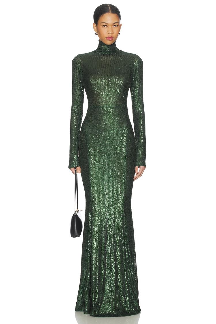 Shimmering dark green sequins adorn this fitted column gown, featuring a sleek maxi length and a sophisticated turtle neckline. The long sleeves and covered back with a hidden zipper closure provide a polished look, while the fishtail hem adds graceful movement. Crafted from midweight polyester with elastane for comfort, this elegant dress is ideal for formal events, cocktail parties, and galas during autumn and winter. Its timeless silhouette and subtle sparkle make it a standout choice for upscale occasions.