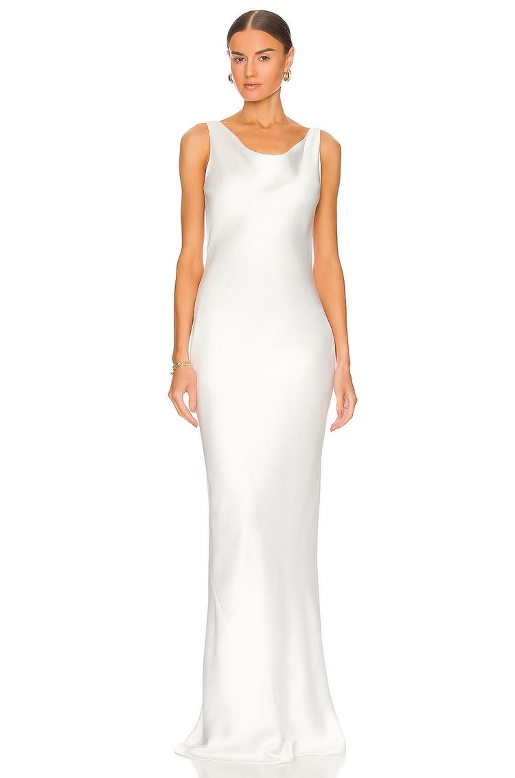 Soft matte white satin and a sleek column silhouette define this maxi gown, featuring a draped neckline and wide straps for a sophisticated, sleeveless look. The fitted cut emphasizes an elegant, minimalist style suitable for formal events, cocktail parties, and romantic date nights. Crafted from midweight polyester satin, this fully lined gown offers a smooth finish and effortless slip-on wearability, making it a timeless addition for all-weather occasions.