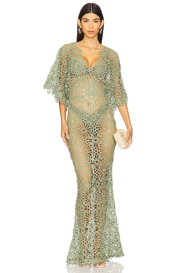 Intricate floral crochet in a matte sage hue shapes a slim, column silhouette that flows to a clean maxi hem. The V-neckline pairs gracefully with elbow-length wide straps, creating an elegant and romantic vibe. Crafted from a cotton-nylon lace blend, this gown offers a sheer, breathable texture perfect for spring and summer occasions. Ideal for cocktail parties, formal events, or wedding guest attire, its slip-on design adds effortless sophistication to your evening wardrobe.