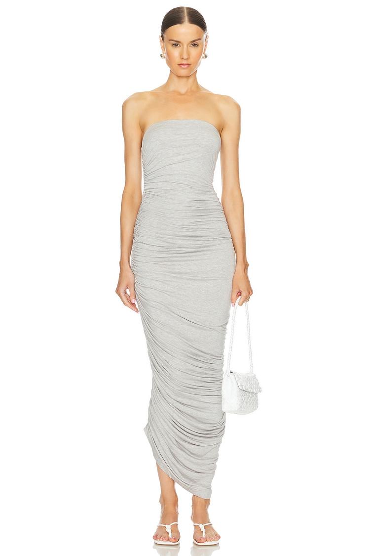 Soft jersey fabric with a body-hugging silhouette defines this elegant strapless column gown, featuring all-over ruching that adds texture and visual interest. The midi-length asymmetric hemline creates a modern edge, while the pull-on styling ensures easy wear. Perfect for cocktail parties, date nights, and night outs, this minimalist chic gown blends comfort with sophistication. Crafted from viscose and spandex blend, it offers gentle stretch and a flattering fit. Ideal for spring and summer events, it’s an effortlessly stylish choice for refined occasions.