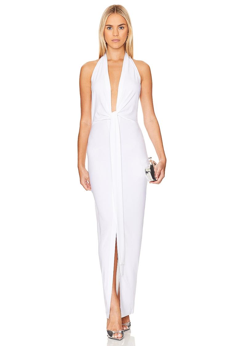 A sleek, figure-hugging column silhouette crafted from midweight polyester-spandex jersey offers a modern take on elegance. The plunging neckline and halter neck combine with a tie-front detail to create a striking, minimalist style perfect for warm spring and summer evenings. The maxi length with a front slit adds movement and allure, making it ideal for cocktail parties, formal events, and night outs. Pull-on ease and unlined comfort enhance its sophisticated charm while the crisp white hue ensures timeless versatility.