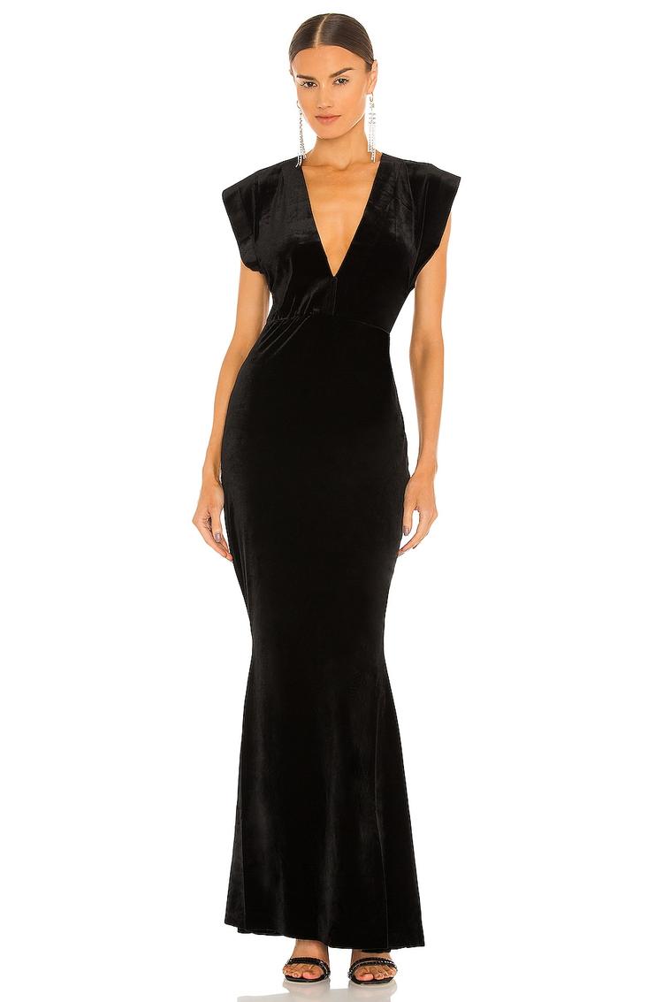Matte black velvet shapes a fitted mermaid gown with a sleek V-neckline and cap sleeves, creating a striking silhouette that flows gracefully to a maxi length. The elastic waist ensures comfort and ease with pull-on styling, making it a sophisticated choice for formal events, cocktail parties, and galas. This elegant gown blends classic silhouette with luxurious fabric, perfect for showcasing timeless style with modern comfort.