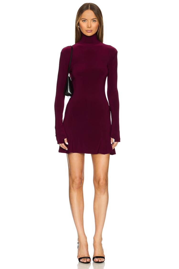 A sleek matte burgundy mini dress crafted from a midweight polyester-spandex jersey blend offers a fitted silhouette with a flattering A-line shape. The long sleeves feature thumbholes for a modern twist, while the mock turtleneck adds warmth and sophistication. A subtle fishtail ruffle hem adds feminine flair, and a hidden back zipper ensures a seamless finish. Ideal for autumn and winter evenings, this chic dress suits date nights, cocktail parties, and stylish night outs with its blend of sexy and modern design elements.