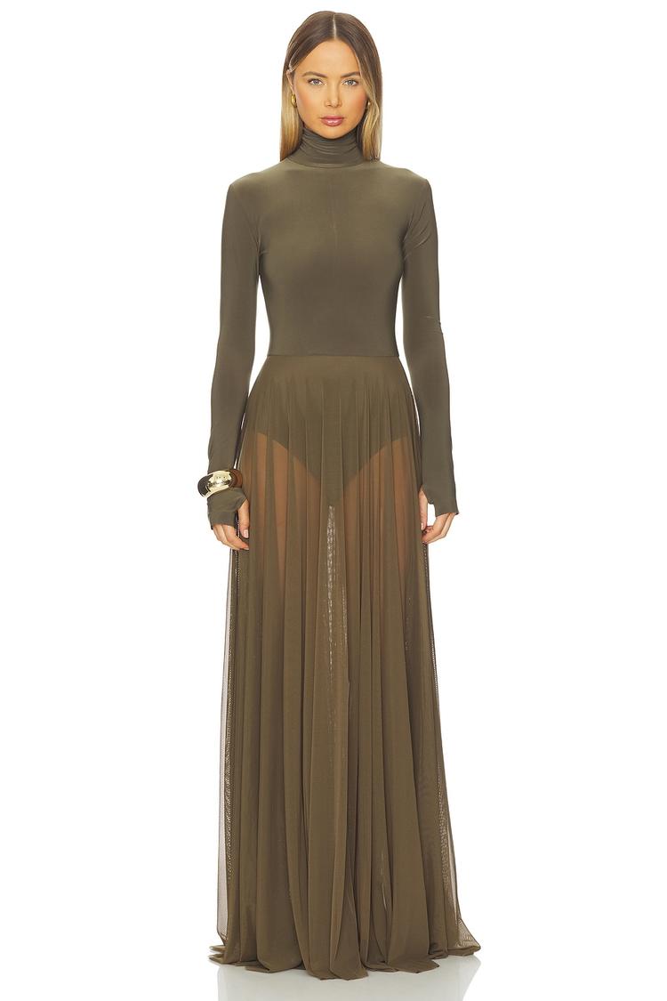 Matte olive green fabric with a sleek column silhouette defines this long-sleeve turtleneck gown. The slim fit and maxi length create an elegant, sophisticated look, while sheer panels add a modern twist. Practical snap gusset and thumbhole details enhance comfort and style. Perfect for formal occasions, cocktail events, or night outs during autumn and winter, this gown pairs classic turtleneck design with contemporary flair and premium polyester-nylon blend fabric for a refined finish.