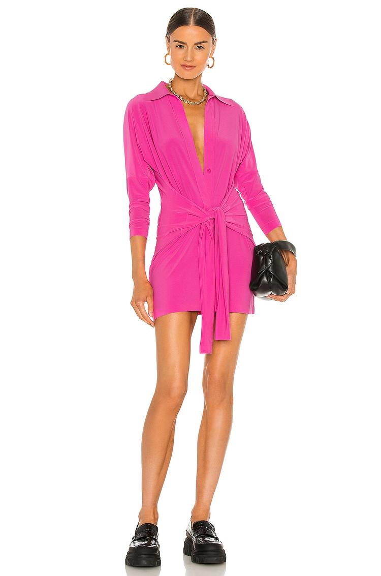 Bright pink slinky fabric forms a bodycon mini shirt dress with a sleek V-neck and long regular sleeves. The attached front wrap waist tie adds a flattering bow detail that accentuates the silhouette. With a clean hemline and pull-on styling, this modern dress is perfect for casual days, brunches, or night outs. Its lightweight polyester-elastane blend ensures comfort and stretch, making it an easy choice for spring to autumn wear. Pair it with sneakers or heels for versatile styling.
