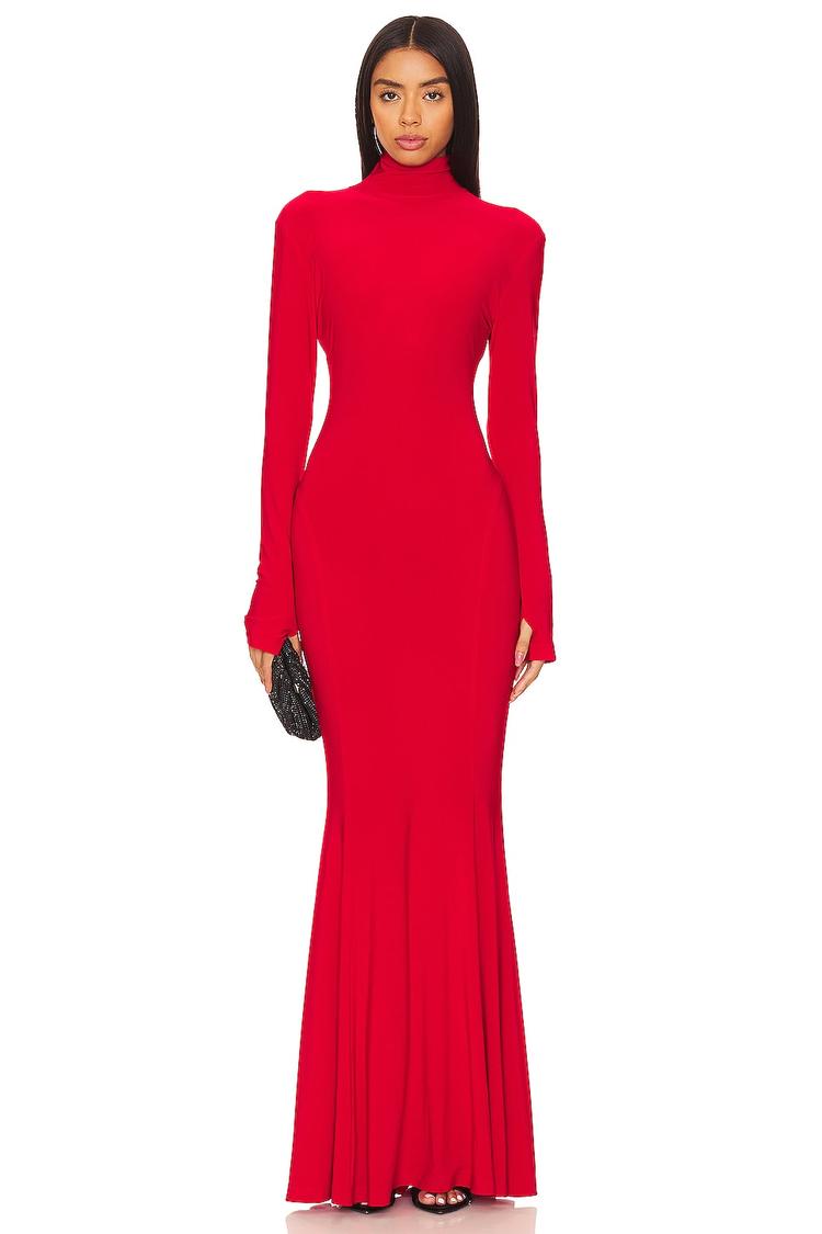 A stunning bright red fishtail gown in a sleek column silhouette offers a bodycon fit that elegantly hugs your curves. Crafted from a midweight slinky jersey fabric blend of polyester and elastane, it features a sophisticated turtle neck and long sleeves with thumbhole cutouts for a modern edge. The pleated flared hem adds dynamic movement, perfect for cocktail parties, date nights, or upscale evening events. The hidden back zipper ensures a seamless look, while the sheen finish enhances its alluring charm across all seasons.