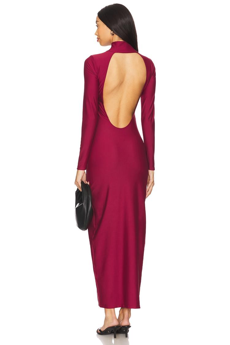 Matte burgundy heavyweight jersey fabric sculpts a fitted sheath silhouette that elegantly flows to a clean maxi hem. A sophisticated turtle neck contrasts with long regular sleeves, while the dramatic open back cut-out adds a modern, sexy twist. This pull-on dress features stretch for comfort and removable cups for shaping, making it perfect for autumn and winter evenings. Ideal for date nights, cocktail parties, or stylish night outs, this elegant dress balances bold design with sleek simplicity for versatile, confident wear.