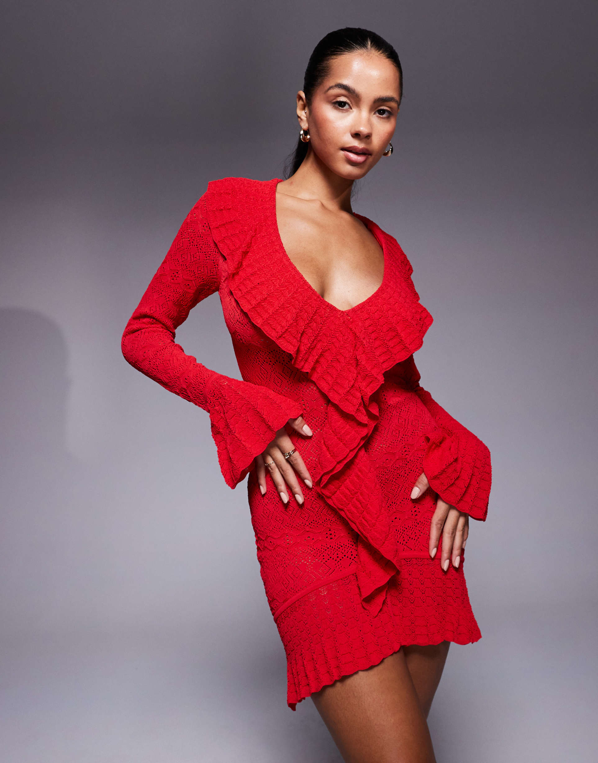 A bold scarlet red sweater dress features a slim silhouette with a plunging neckline and dramatic flared sleeves. Crafted from a delicate pointelle knit fabric, this mini dress is accentuated with ruffle detailing along the neckline and hem, adding playful texture and movement. Ideal for autumn and winter evenings, it pairs perfectly with boots for date nights, girls' nights out, or casual social events. The ruffled hem and sleeves elevate this trendy piece, making it a standout choice for those seeking a sexy yet cozy style.