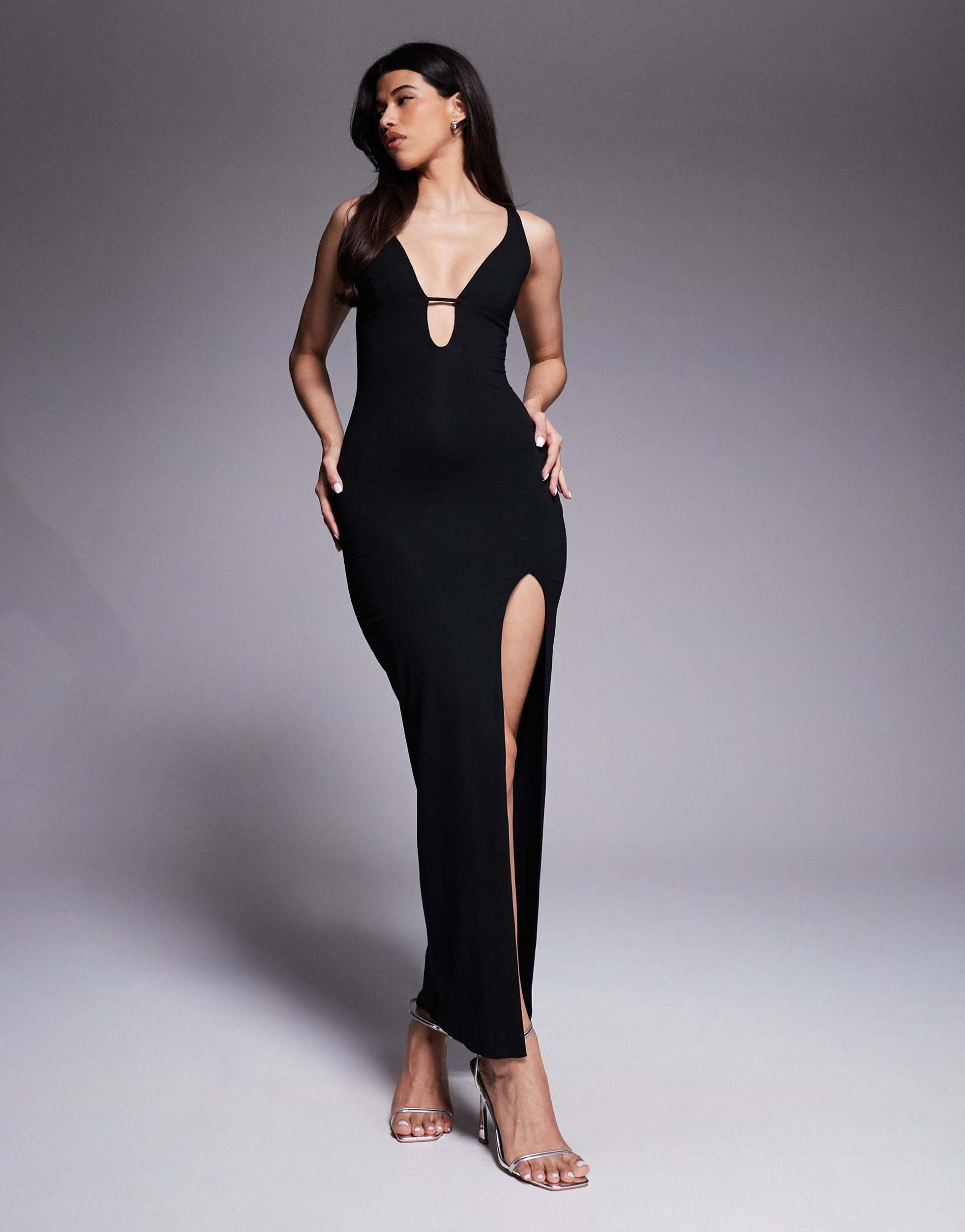 A sleek matte black sheath silhouette defines this maxi dress, crafted from soft, stretchy jersey fabric that contours to your figure with a slim fit. The daring plunge neckline and sleeveless styling enhance its modern, sexy appeal, while a thigh-high slit adds a bold edge to the flowing hemline. Cut-out details at the front and skirt elevate its design, making it ideal for cocktail events, night outs, or intimate date nights. This versatile piece pairs effortless sophistication with comfortable stretch, perfect for all-weather wear.