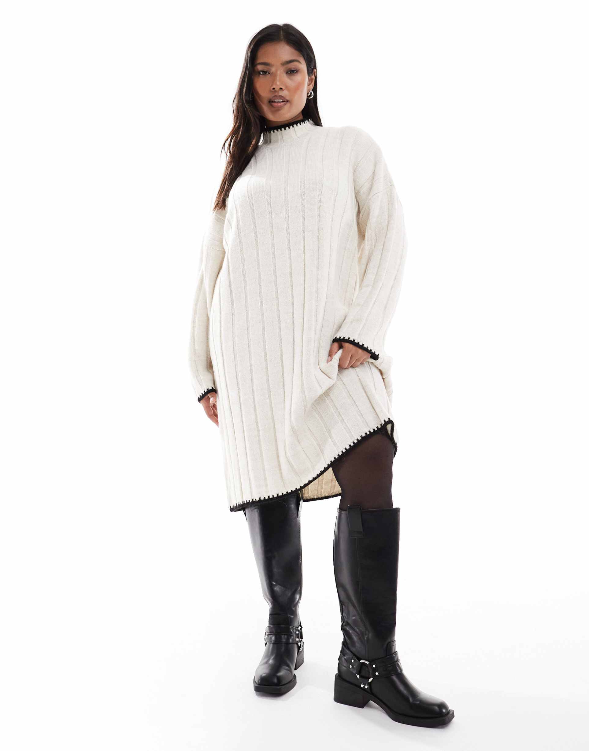 ONLY CURVE CONTRAST STITCH KNIT MINI DRESS IN WHITE