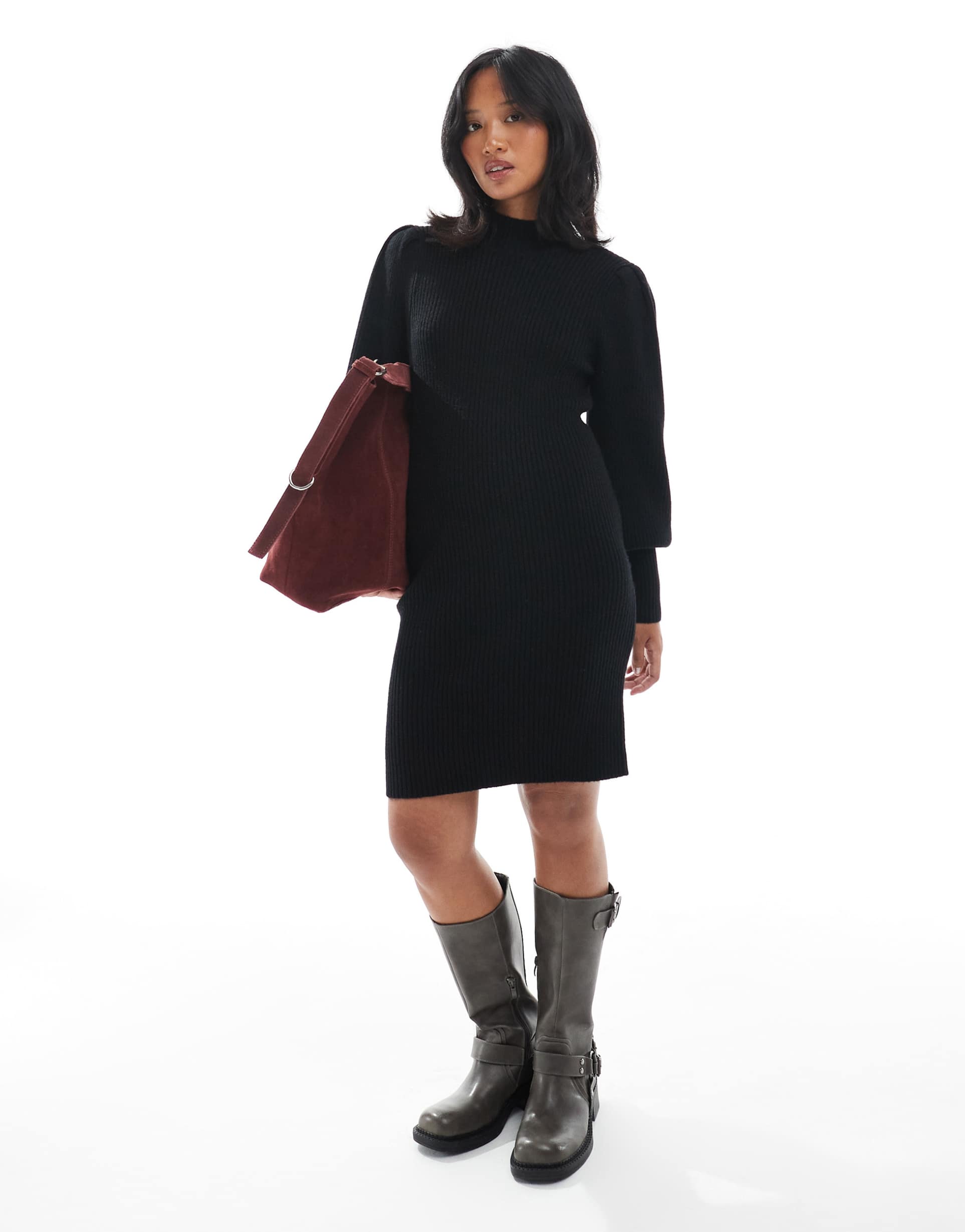 ONLY PETITE HIGH NECK PUFF SLEEVE MINI SWEATER DRESS IN BLACK