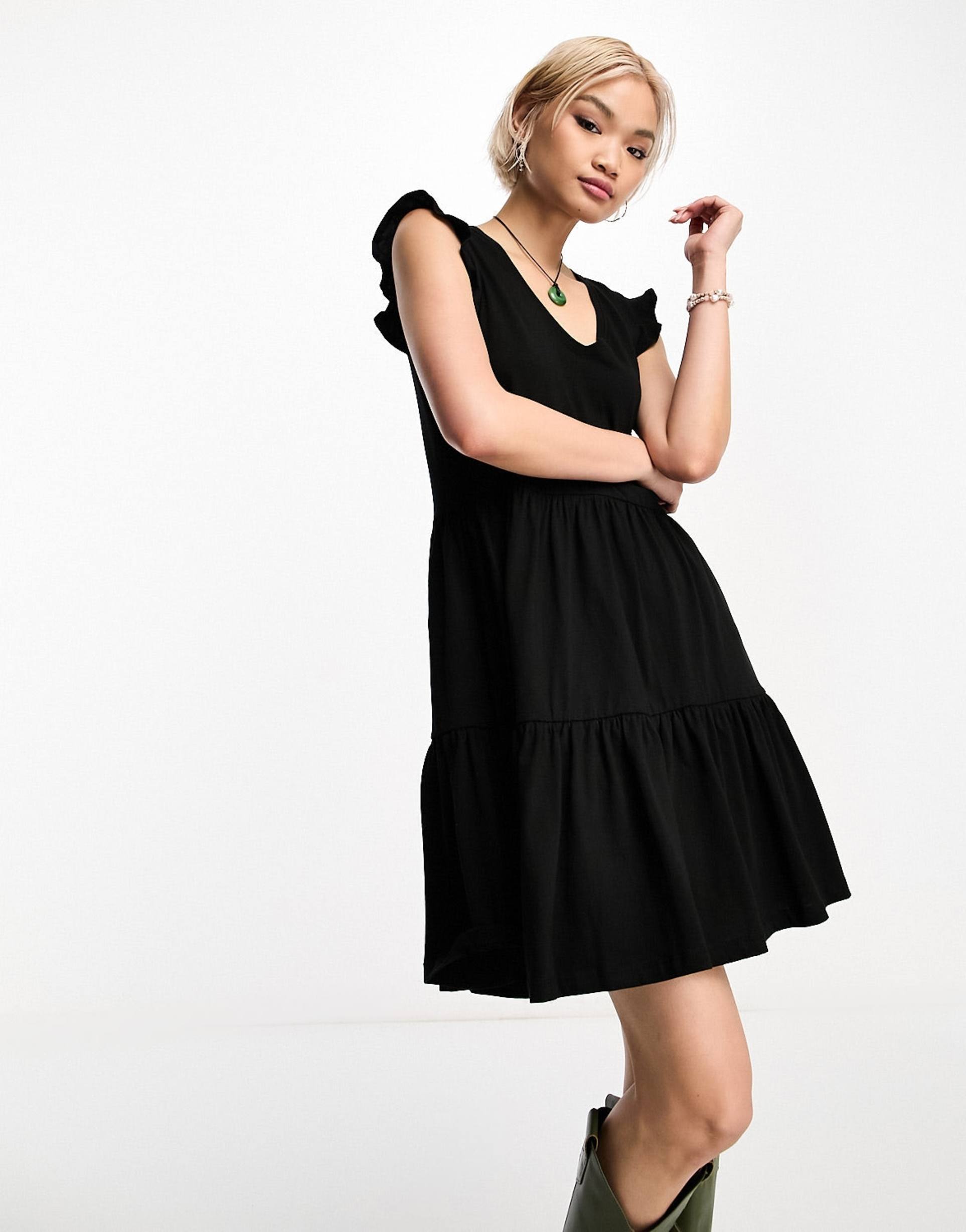 ONLY TIERED FRILL SLEEVE MINI DRESS IN BLACK