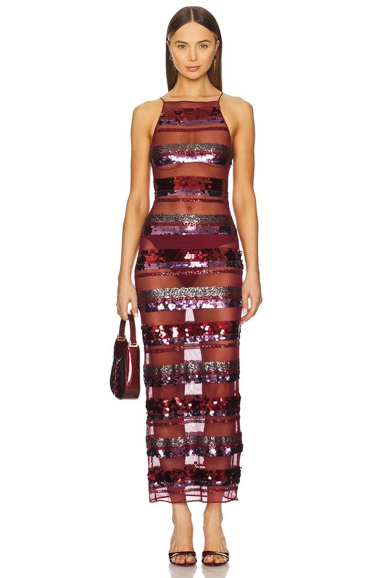 Striking in shimmering dark red and black stripes, this fitted column dress features a sleek straight neckline and sleeveless styling that enhances its modern elegance. Crafted from polyester and mesh with all-over sequin embellishments, it offers a dazzling effect perfect for cocktail parties, formal evenings, or night outs. The maxi length with a clean hemline and strappy back closure adds sophistication and allure, while the sheer mesh panels provide a bold, fashion-forward touch. Ideal for making an unforgettable statement at upscale events.