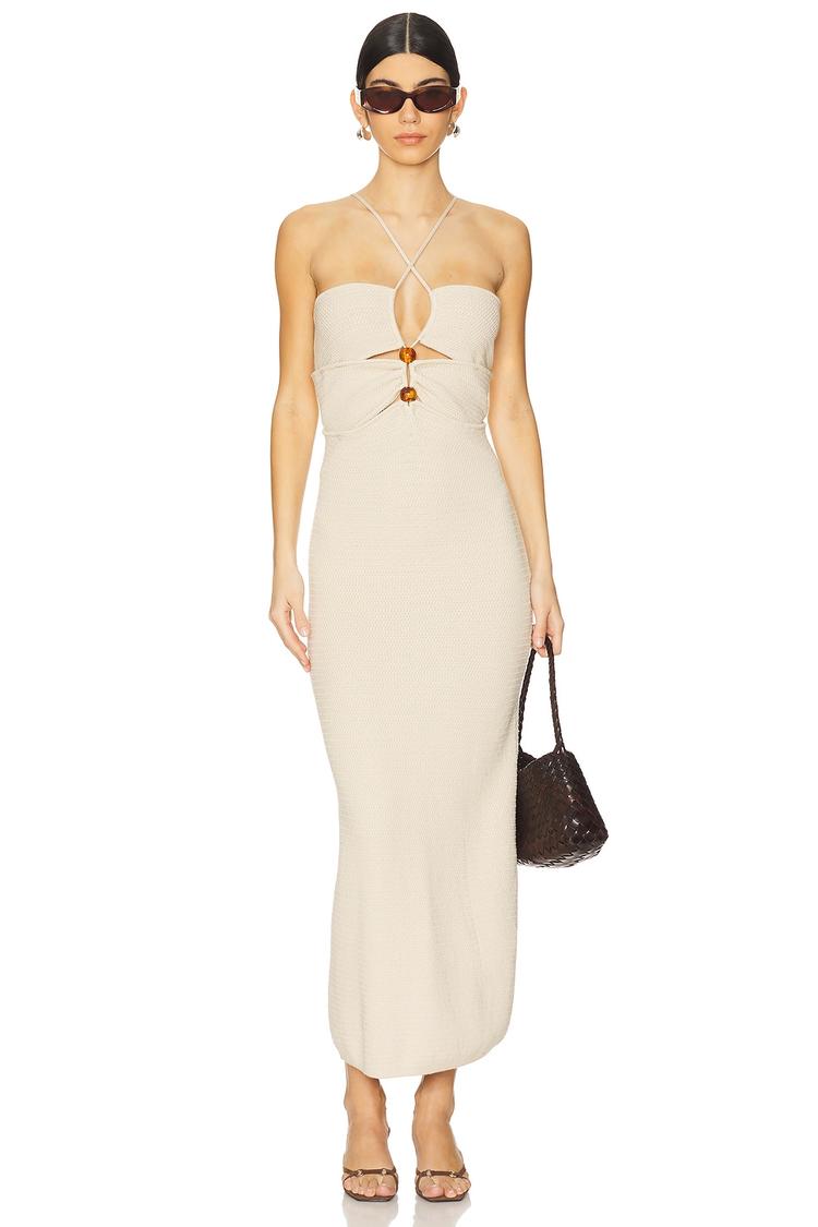 Soft heavyweight knit fabric and a figure-hugging slip dress silhouette create an effortlessly sexy look. The straight neckline is complemented by adjustable spaghetti straps and tonal bead accents at the front cut-outs, adding delicate detail to the minimalist design. Falling to a flattering midi length with a subtle front slit, this beige dress is ideal for warm spring and summer evenings. Its pull-on fit and comfortable stretch make it perfect for date nights, cocktail parties, or a stylish night out with friends.