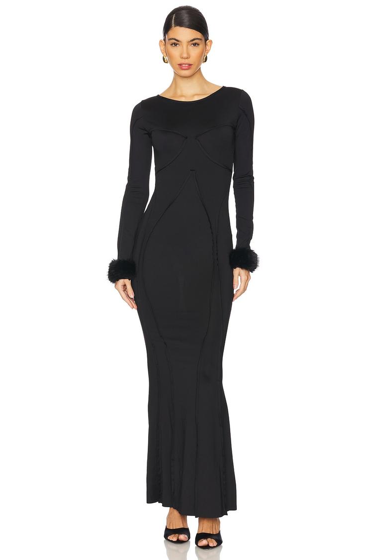 Sleek and figure-flattering, this matte black column maxi dress features contour stitching that sculpts the silhouette with precision. Crafted from a midweight slinky jersey fabric with a subtle stretch, it offers a fitted yet comfortable wear. The long sleeves end in elegant faux fur trimmed cuffs, adding a touch of luxe sophistication. A round neckline and clean hemline complete the minimalist look. Ideal for autumn and winter evenings, this dress suits cocktail events, date nights, and night outs with effortless elegance.