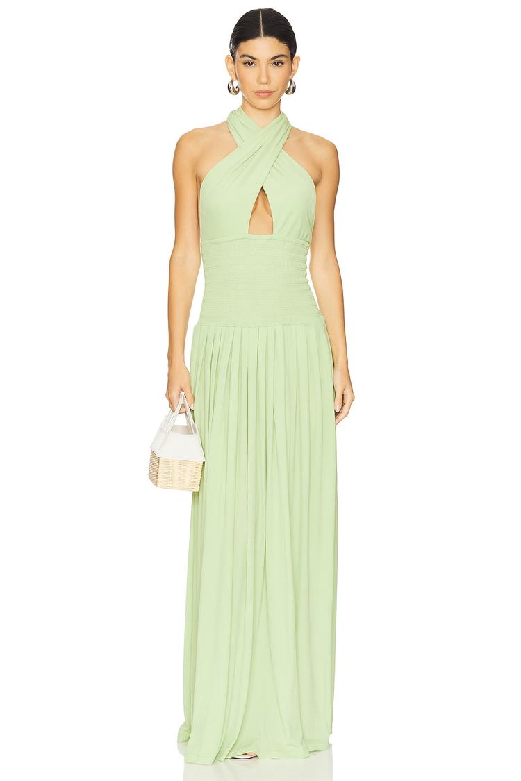 Soft matte light green challis fabric cascades into a flowing maxi column silhouette that flatters with a fitted bodice and halter neckline. The sleeveless design and self-tie halterneck create an elegant neckline, while the smocked back adds subtle texture and comfort. Perfectly suited for spring and summer occasions, this versatile dress shines at brunch, date nights, and cocktail events. Its pull-on style ensures easy wear, making it an effortlessly chic choice for vacation or special outings.