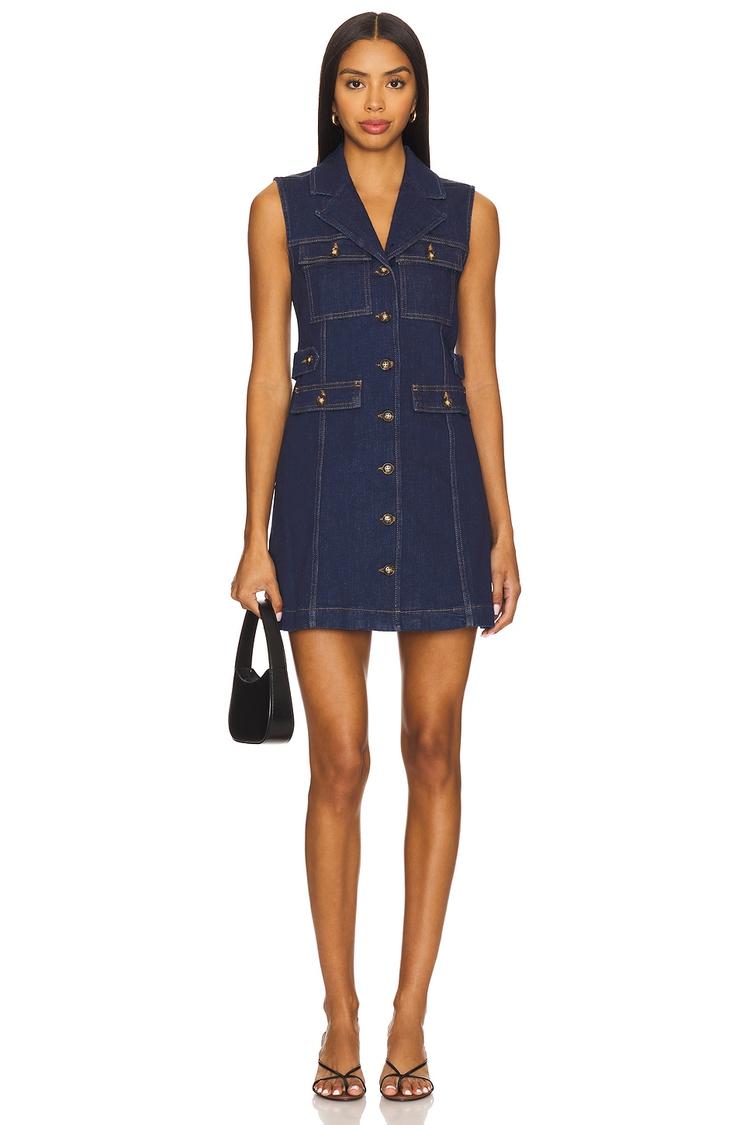 Heavyweight cotton denim forms a structured mini shift dress featuring a classic notched lapel collar and sleeveless styling. The front button closure and decorative breast and faux button pockets add timeless appeal, while the fitted yet regular silhouette ensures comfort and ease. Its matte dark blue hue is accented by bronze buttons, perfect for casual brunches, workwear, or laid-back date nights. Ideal for spring through autumn, this versatile dress combines classic denim charm with polished detailing for a chic, effortless look.