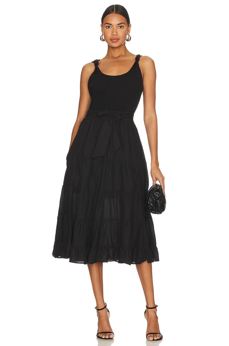 Effortless elegance defines this black midi dress featuring a scoop neckline and wide straps with subtle knot ribbon details at the shoulders. The ribbed jersey bodice flows into a crisp, tiered poplin A-line skirt, creating a flattering regular fit that moves gracefully. Designed with practical pockets and a detachable waist tie for versatile styling, this breathable cotton-rayon blend is perfect for casual outings, brunches, or stylish workwear occasions during warmer seasons.