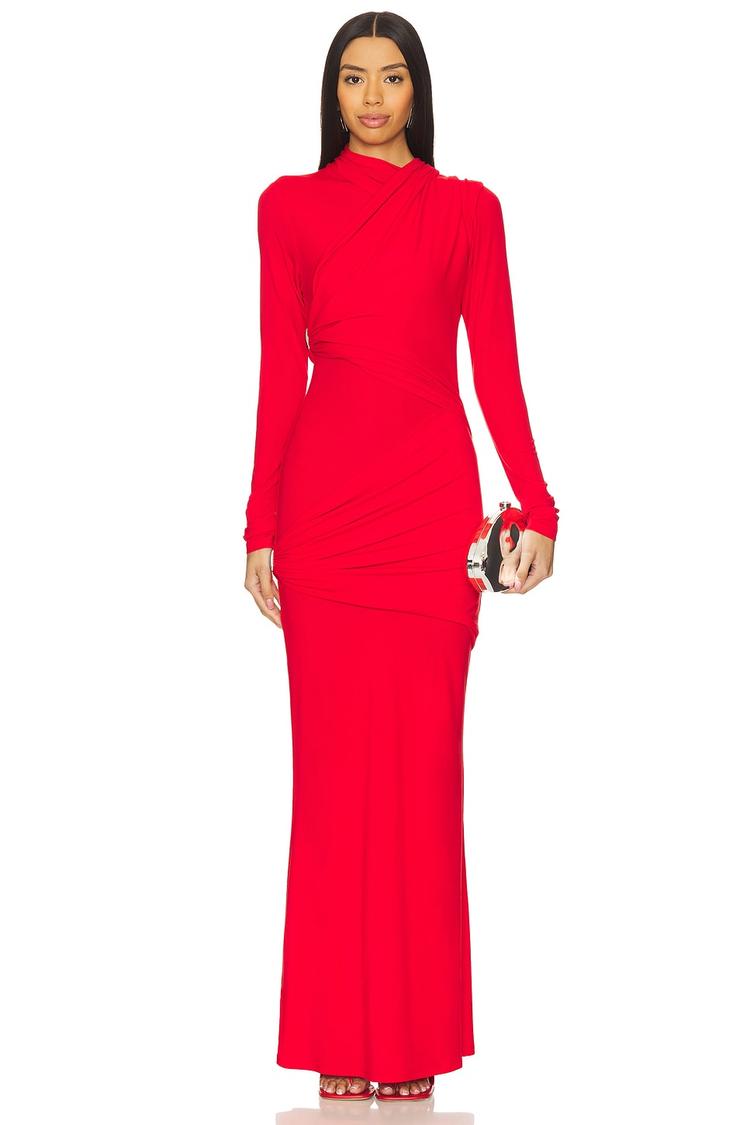 A sleek red column maxi with a high neckline and long sleeves exudes timeless sophistication. Crafted from a lightweight ruffled jersey fabric with a comfortable modal-spandex blend, this fitted silhouette gracefully skims the body. The delicate ruffle detailing at the front adds subtle texture and elegance. Ideal for formal occasions, cocktail parties, and romantic date nights, its pull-on slip-on style ensures ease of wear. This elegant dress promises both style and comfort for all-season wear, making it a versatile choice for refined wardrobes.