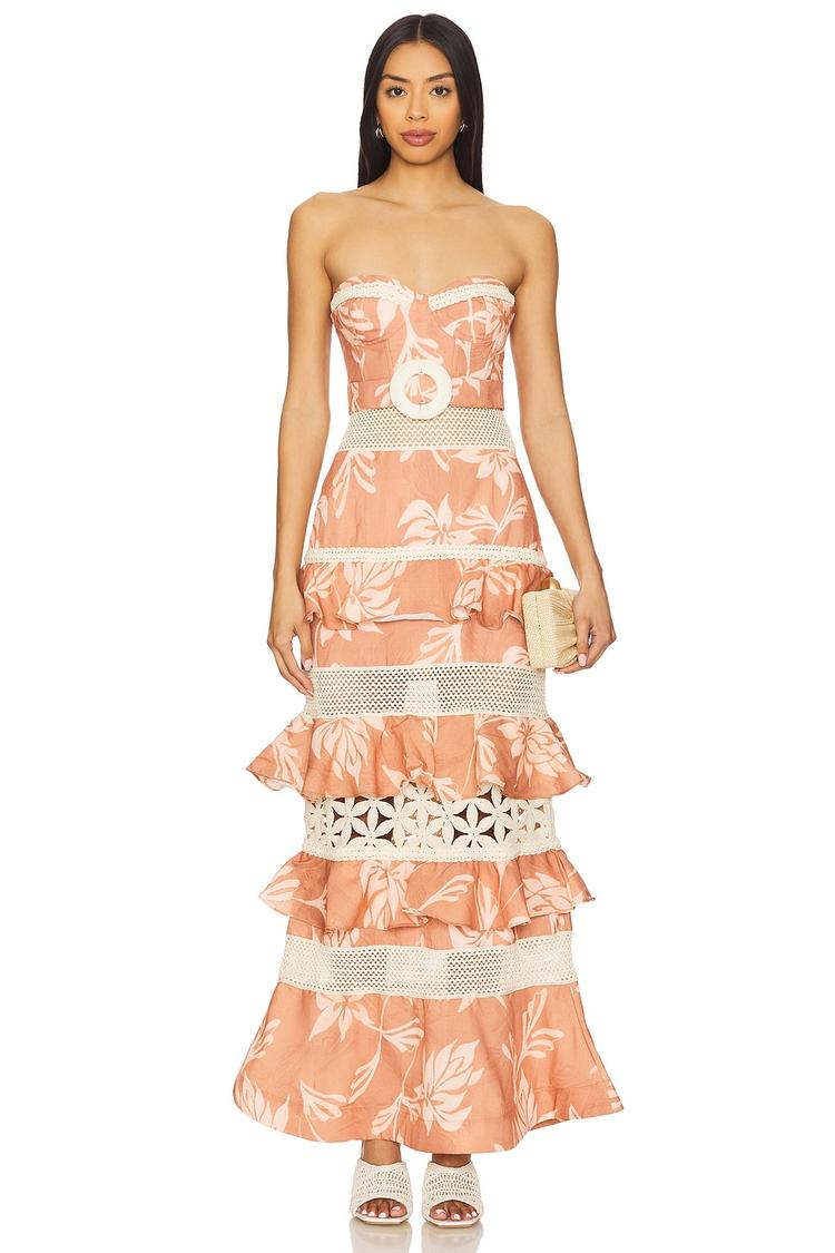 Soft peach hues and delicate white floral patterns mingle on this fitted column maxi dress, enhanced by layers of ruffles and open crochet trim for a romantic bohemian vibe. The strapless sweetheart neckline and boned bodice ensure a flattering silhouette, while detachable adjustable straps add versatility. Crafted from a blend of polyester, cotton, and linen, its midweight fabric offers breathable comfort perfect for spring and summer occasions like brunch, cocktail evenings, or date nights. A hidden back zipper and faux belt detail complete this elegant yet effortless piece.