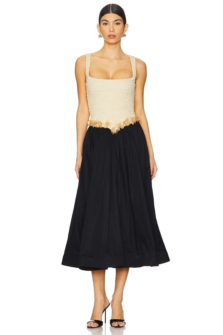 Soft matte cream jersey forms the fitted bodice with delicate spaghetti straps and a square neckline, accented by 3D floral appliques at the waist for romantic detail. The heavyweight matte black jacquard skirt flows into a clean midi hemline, enhanced by practical side seam pockets. This fit and flare midi dress combines textured fabrics for a sophisticated look perfect for brunch, date nights, or cocktail events in spring and summer.
