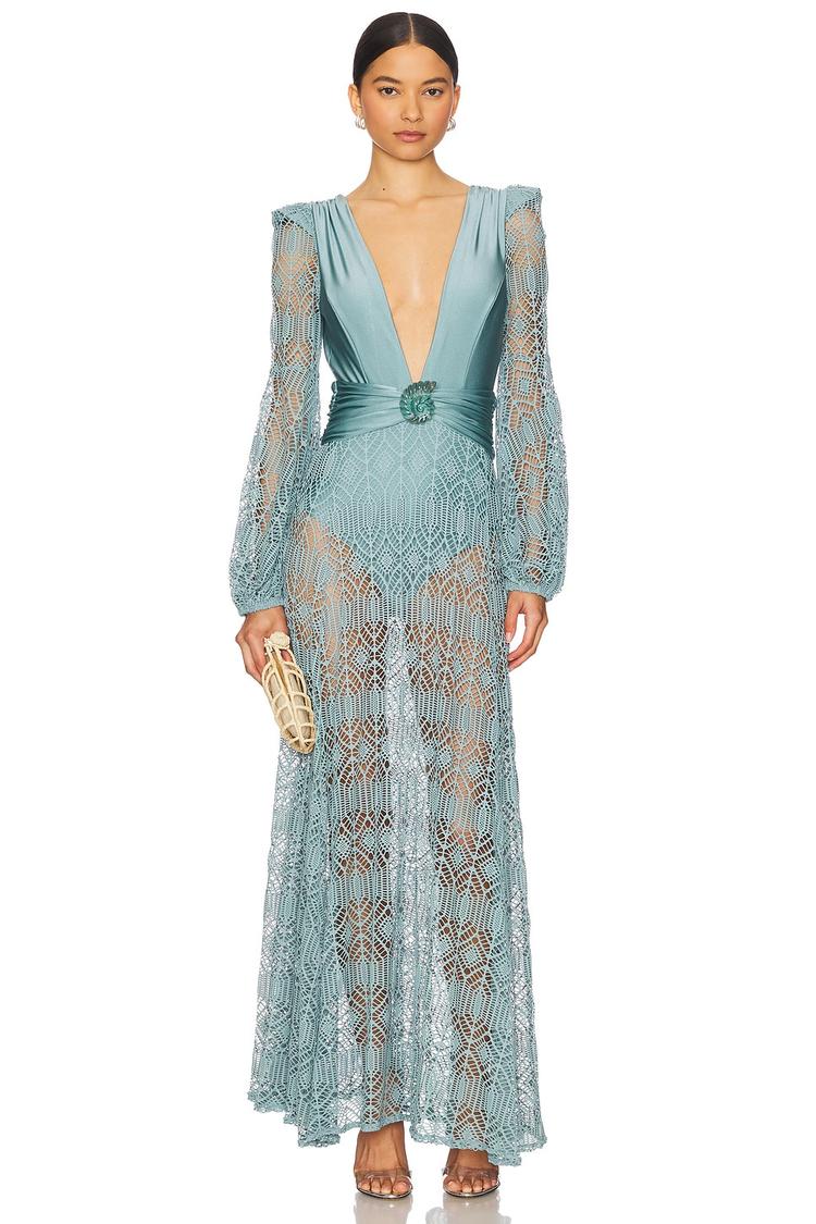 Softly crafted from midweight high-shine nylon jersey, this fitted sheath dress features a plunging neckline and sheer crochet panels that create an alluring silhouette. The maxi length, long sleeves, and subtly padded shoulders with ruffle details add elegance and modern sophistication. The back tie closure enhances the chic, adjustable fit. Ideal for beach vacations, cocktail events, or warm spring and summer outings, it pairs a tonal shell accent with a flattering bodysuit lining for stylish coverage beneath sheer layers.