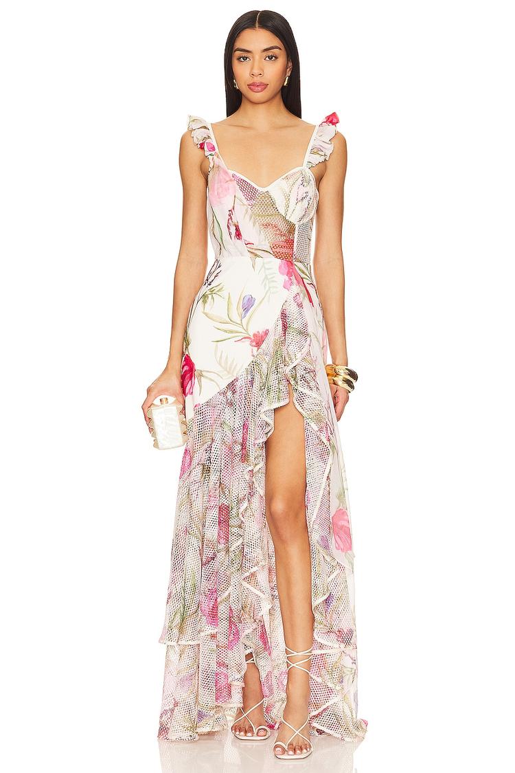 Soft floral prints on a matte off-white satin and knit fabric create a romantic and elegant maxi wrap dress. Featuring a fitted silhouette with a plunging V-neckline and delicate ruffled hemline cascading all over, this sleeveless gown balances sophistication and femininity. The hidden back zipper and partially lined construction ensure a smooth fit, perfect for spring and summer occasions. Ideal for cocktail parties, date nights, and formal events, its flowing maxi length and ruffle details provide graceful movement and timeless charm.