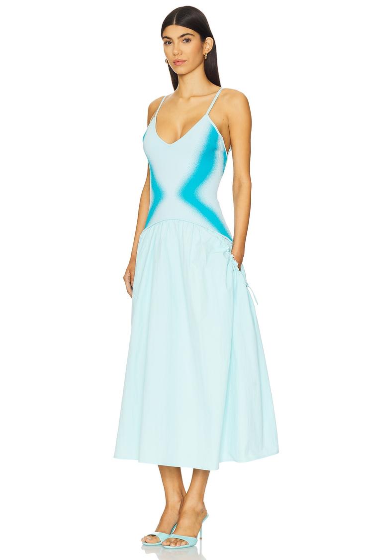 Soft matte light blue poplin flows into a breezy midi hem, contrasted with bright blue color-blocking that sculpts the fitted jersey bodice. Adjustable spaghetti straps and a flattering V-neckline enhance the minimalist slip dress silhouette. Stretchy fabric ensures comfort while side pockets add practical appeal. This versatile dress suits casual outings, brunches, and date nights with effortless chic style in warmer seasons.
