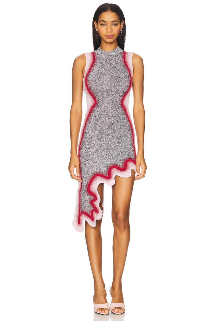 A bold asymmetrical hemline and wavy abstract pattern define this modern sheath dress in a midweight knit ponte fabric. The fitted silhouette complements the high neckline and sleeveless design with wide straps, creating a sleek profile. The striking interplay of matte gray with pink and red accents makes it a standout choice for cocktail parties, night outs, and date nights. Slip it on effortlessly for a chic, trend-forward look that transitions seamlessly across seasons.