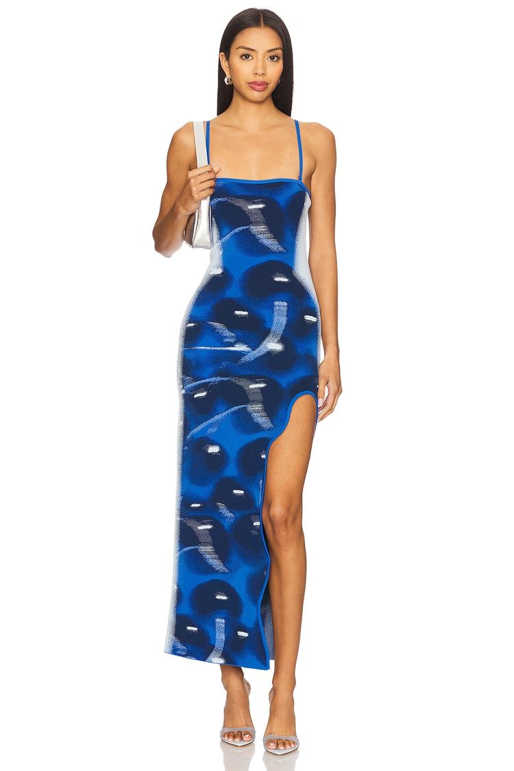 A sleek silhouette and shimmering dark blue abstract print come together in this modern slip dress. Crafted from a midweight ponte blend with viscose and spandex for a slim fit, it features a straight neckline and optional detachable straps for versatile styling. The maxi length with a bold thigh slit adds a sexy edge, making it perfect for cocktail parties, date nights, and nights out. Its pull-on design ensures easy wear and a flattering fit that moves effortlessly with you in spring and summer.