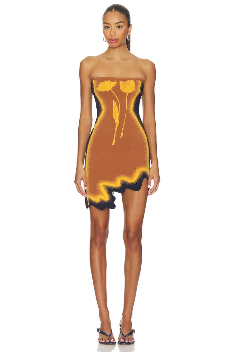 A figure-hugging slip dress with a striking abstract pattern in matte brown, yellow, and black brings modern edge to your wardrobe. The mini length and asymmetric hemline add playful flair, while the straight neckline and strapless silhouette highlight shoulders beautifully. Crafted from a blend of viscose, rayon, polyester, and spandex, it offers comfortable stretch and a sleek fit. Detachable shoulder straps provide styling versatility, perfect for casual days, night outs, or date nights in warmer seasons.