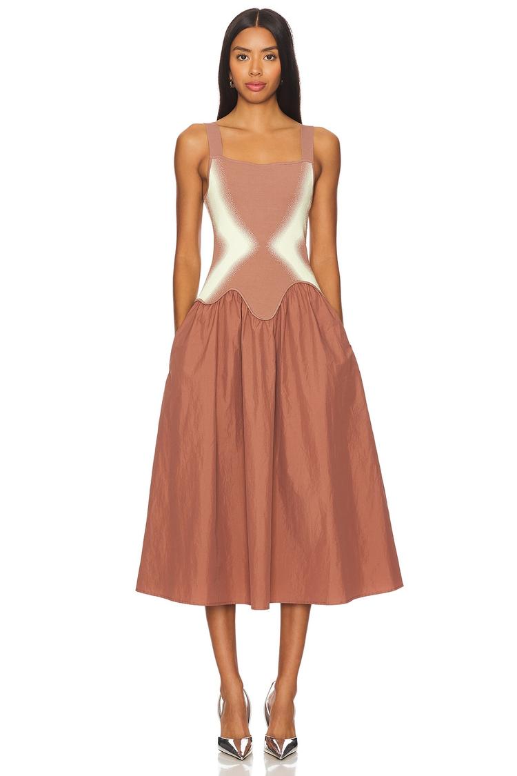 A modern take on classic elegance, this fit and flare midi dress features a striking square neckline and sleeveless strap styling for a sleek silhouette. The ponte bodice in a soft off-white contrasts beautifully with the matte rust poplin skirt, creating a minimalist yet eye-catching look. Its fitted top and flowy skirt make it versatile for casual brunches, date nights, or relaxed daytime events. Crafted from a blend of recycled viscose, nylon, cotton, and spandex, it offers comfort and sustainability in one refined piece.