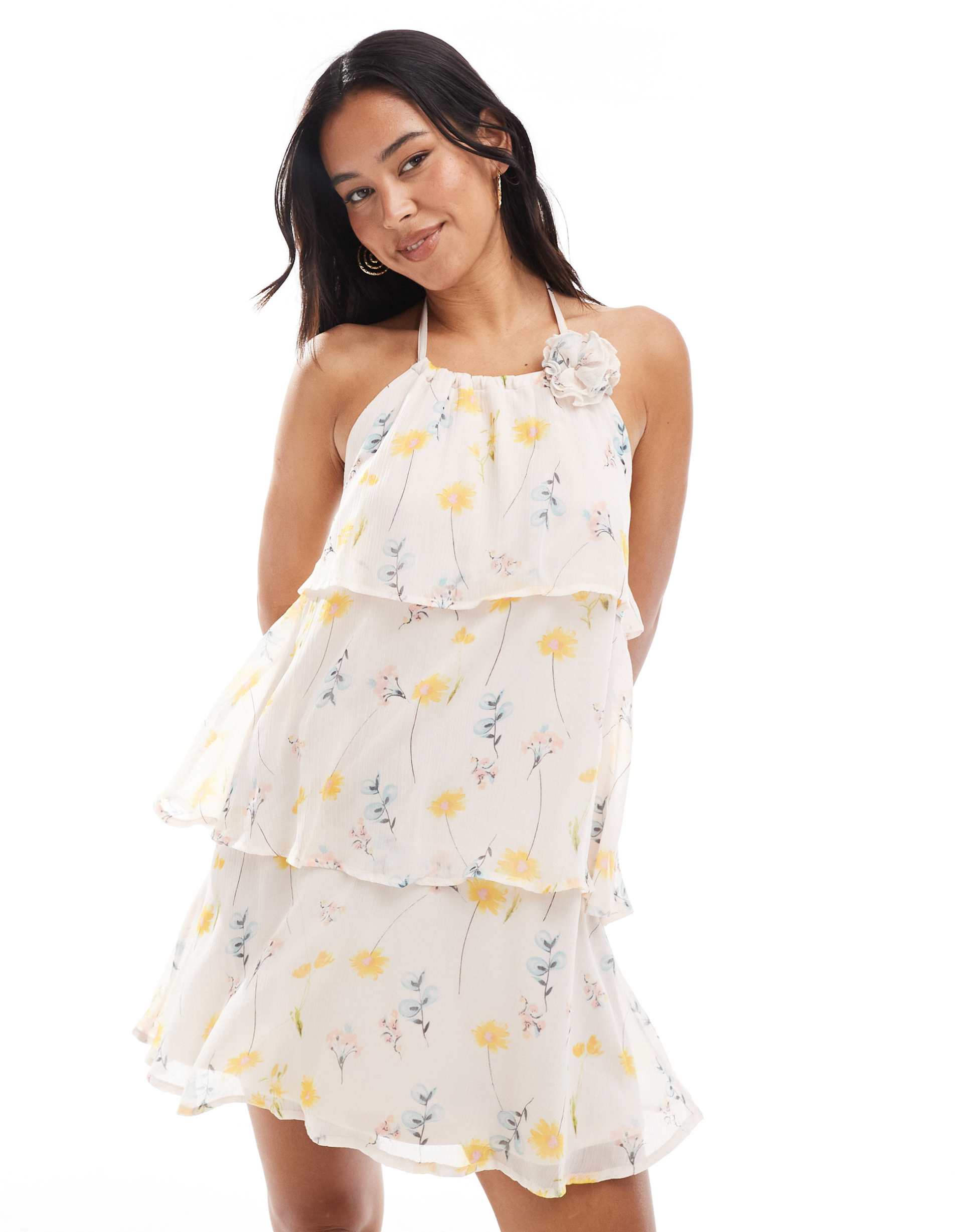 PIECES RUFFLE TIERED MINI DRESS WITH CORSAGE DETAIL IN PALE PINK FLORAL PRINT