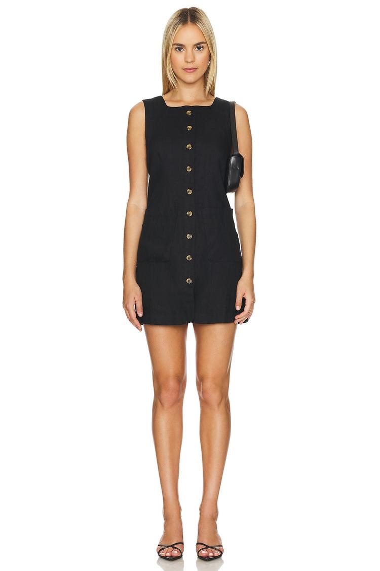 Classic matte black linen meets a sleek shift silhouette with a mini length that highlights your legs. The sleeveless cut and wide straps complement the round neckline, while the front button closure with an attached adjustable buckle strap adds subtle detail and functionality. Fully lined with cotton for comfort, this dress features a clean hemline and a small bow detail at the back for understated charm. Ideal for casual outings, brunch dates, or everyday wear in spring through autumn, this dress balances minimalist style with breathable natural fabrics.