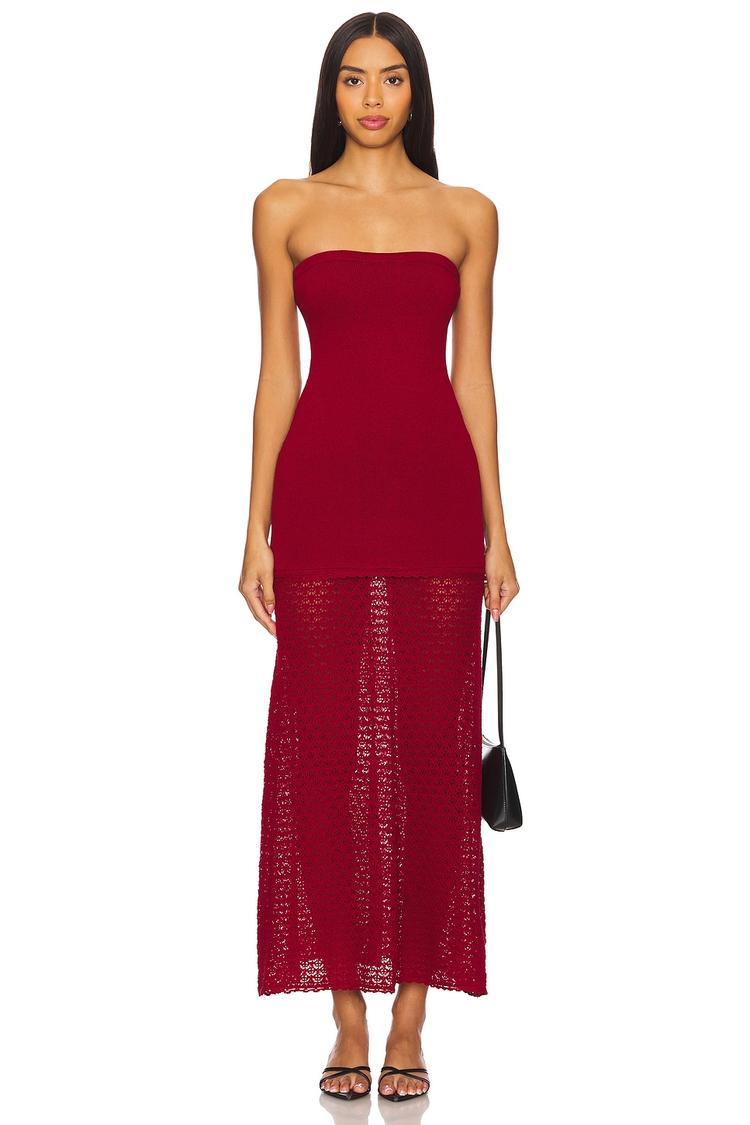 A strapless, figure-hugging sheath silhouette in matte burgundy creates a striking presence with its scalloped hem detail. Crafted from a heavyweight jersey blend of polyester and viscose, this maxi-length dress offers modern sexiness and all-weather versatility. The pull-on style ensures easy wear, making it an excellent choice for date nights, cocktail parties, or evenings out. Smooth lines emphasize the bodycon fit, while the ruffled scalloped hem adds a subtle feminine touch. This Romy dress balances comfort and style effortlessly, perfect for sophisticated, confident occasions.