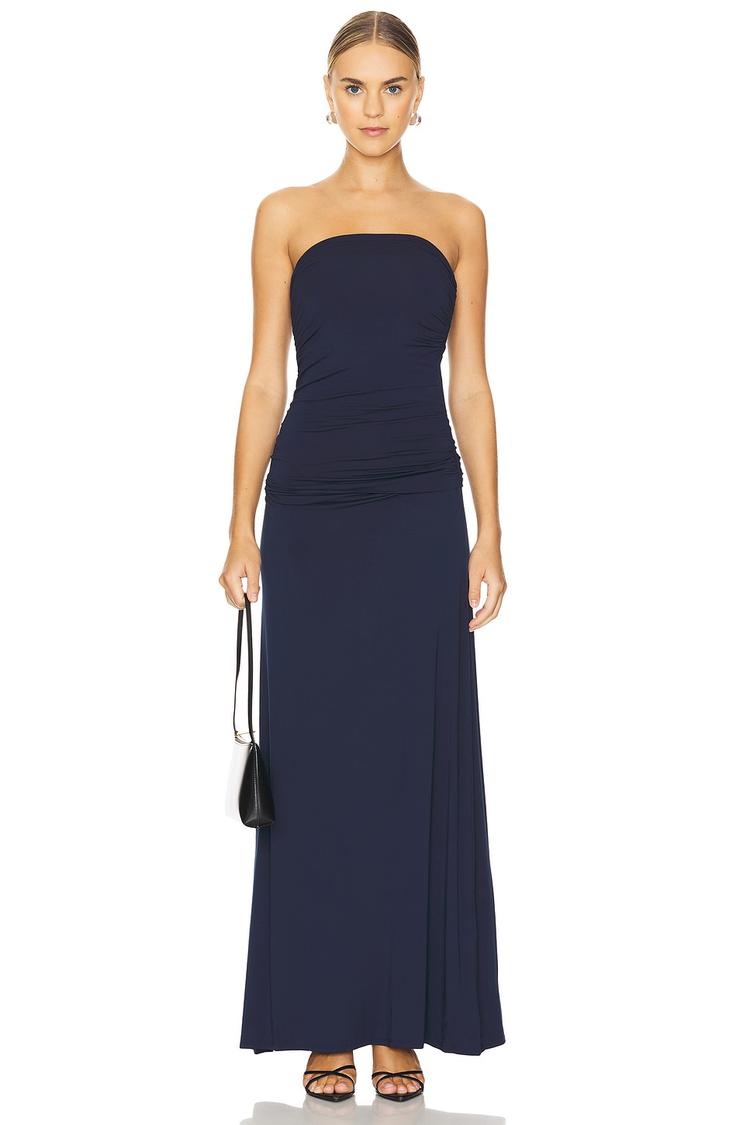 Soft jersey fabric with subtle ruching along the sides sculpts a sleek, column silhouette in this elegant maxi dress. The strapless neckline and fitted bodice highlight the shoulders and waist, creating a minimalist and classic look perfect for cocktail parties, date nights, or semi-formal events. Its pull-on styling ensures easy wear while the viscose-elastane blend offers comfortable stretch and drape. A versatile choice for all seasons, this navy blue dress combines understated sophistication with effortless style.