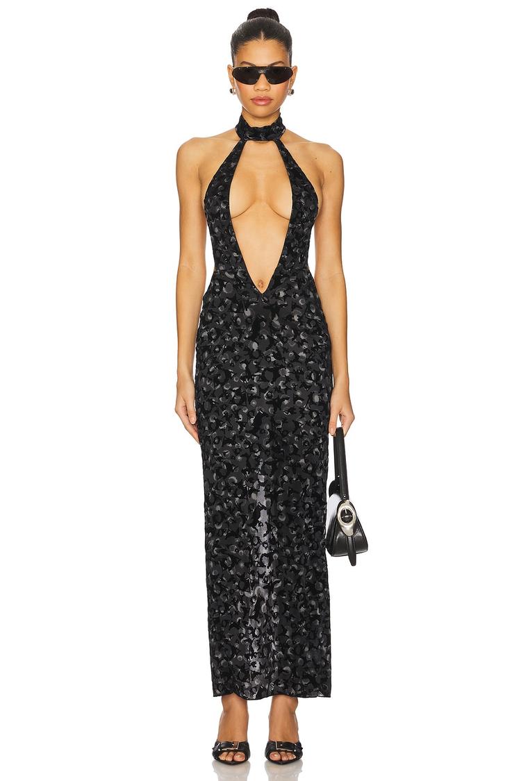 A daring silhouette crafted from midweight mesh fabric with velour details, this black slip dress features a plunging neckline and a back tie closure that accentuates the slim fit. The midi length and sleeveless, strapless styling add to its sultry appeal, while the all-over leopard and adult-themed print bring a bold, trendy edge. Ideal for night outs, cocktail parties, and date nights, this versatile piece combines sexy charm with contemporary flair for confident, standout dressing.