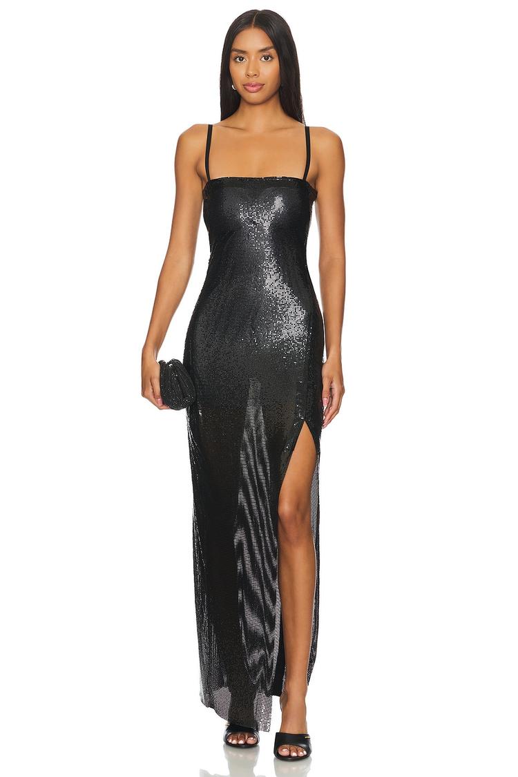 Shimmering black crystal chainmail fabric sculpts a sleek column silhouette with a straight neckline and adjustable spaghetti straps. This fitted maxi dress features an alluring side slit and an exposed side zipper, perfect for cocktail parties, night outs, or formal events. The partially lined design with detachable padded cups offers comfort and support, while the sparkling chain detail adds a sophisticated edge. Crafted from polyamide and elastane, it combines stretch and shine for an effortlessly glamorous look that transitions beautifully across seasons.