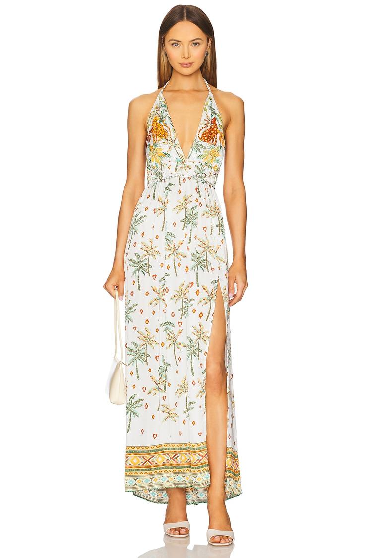 Sunlit beach days and warm spring evenings call for this breezy maxi slip dress featuring a plunging neckline and halterneck styling. Crafted from midweight viscose sateen, the slim silhouette gracefully hugs the body while a high side slit adds a touch of allure. The white base is adorned with a soft floral print and bordered hem, enhancing its bohemian charm. The open back with tie closure and sleeveless design make it perfect for vacation, brunch, or date night occasions.