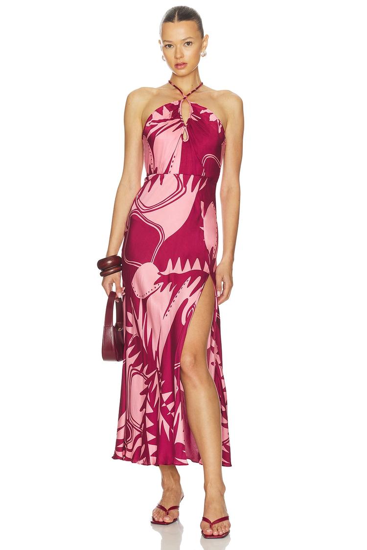 Soft viscose satin lends a smooth, lightweight feel to this slim-fit slip dress, featuring a halter neck with tie closure and a hidden back zip for a sleek silhouette. The midi length with a daring front slit adds a sultry touch, while the bold floral print in dark and bright pink hues creates a vibrant statement. Ideal for spring and summer, this dress effortlessly suits brunches, date nights, beach vacations, and lively night outs, combining comfort with alluring style.