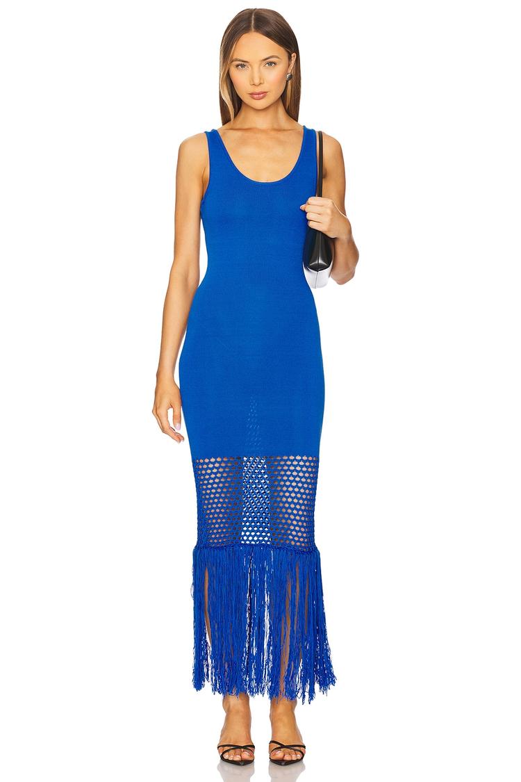 Bright blue heavyweight crochet fabric and a figure-hugging sheath silhouette create a standout look with a fringed hem that adds playful movement. The sleeveless design with wide straps and a U-neckline offers a chic and trendy vibe perfect for summer evenings. Ideal for date nights, cocktail parties, and night outs, this Claudia Fringe Dress balances bold style with comfort thanks to its pull-on fit and breathable blend of viscose, nylon, polyester, and cotton.
