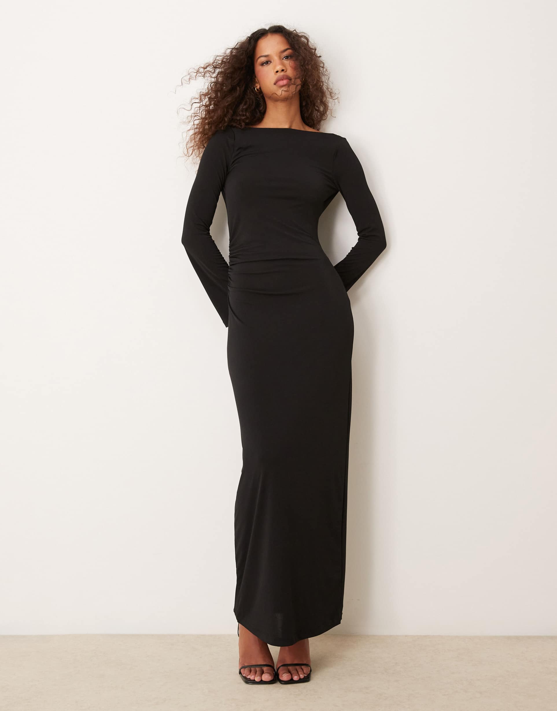 Soft and stretchy jersey fabric sculpts a sleek sheath silhouette in a matte black hue, perfect for making a refined statement. Featuring a distinctive slash neckline and an open back, this maxi-length dress balances elegance with subtle allure. Long sleeves add to the sophisticated profile, while a regular fit ensures comfortable wear throughout the evening. Ideal for cocktail parties, night outs, or romantic date nights, this dress blends minimalist style with versatile appeal for all-weather occasions.
